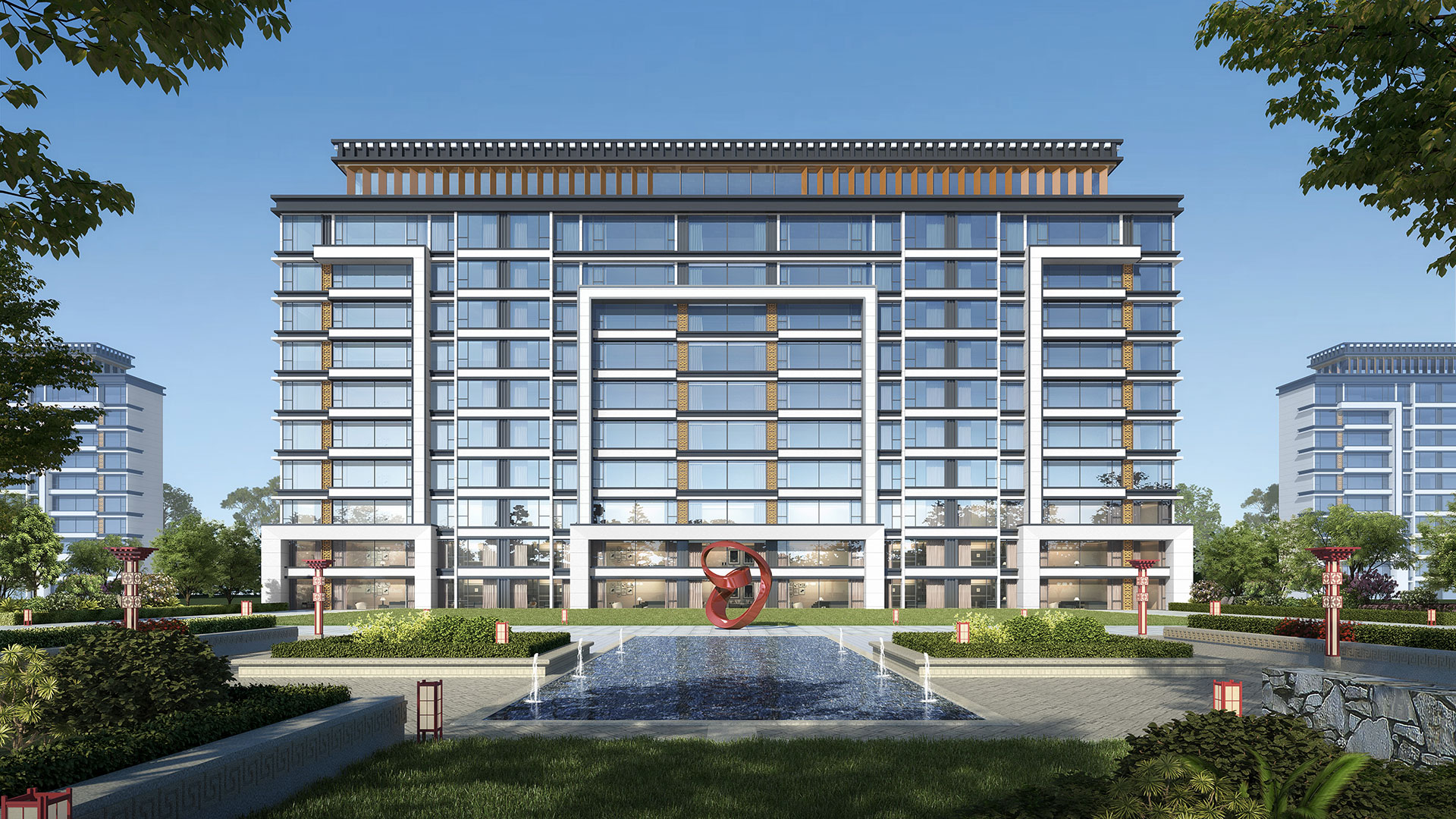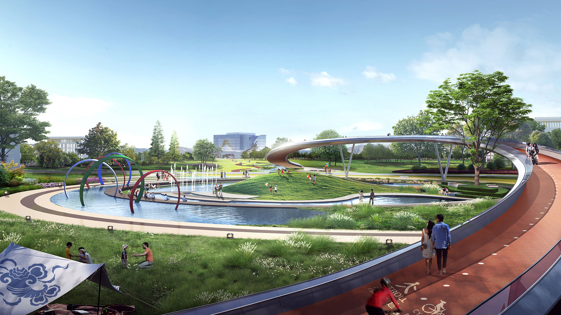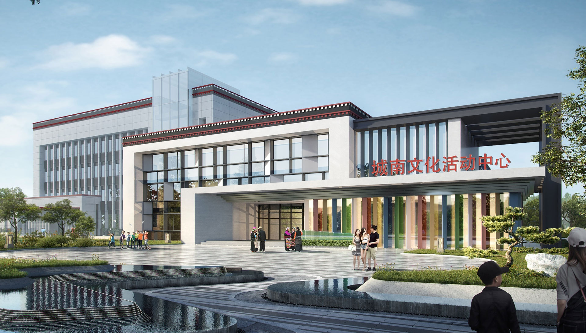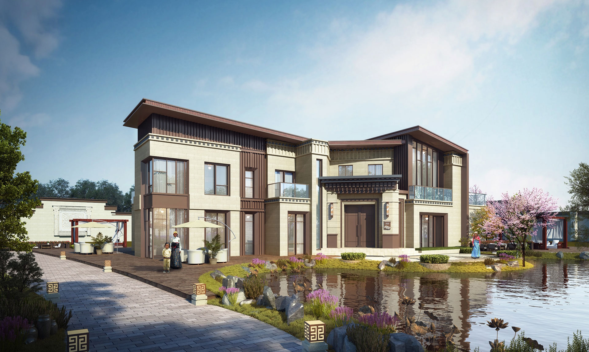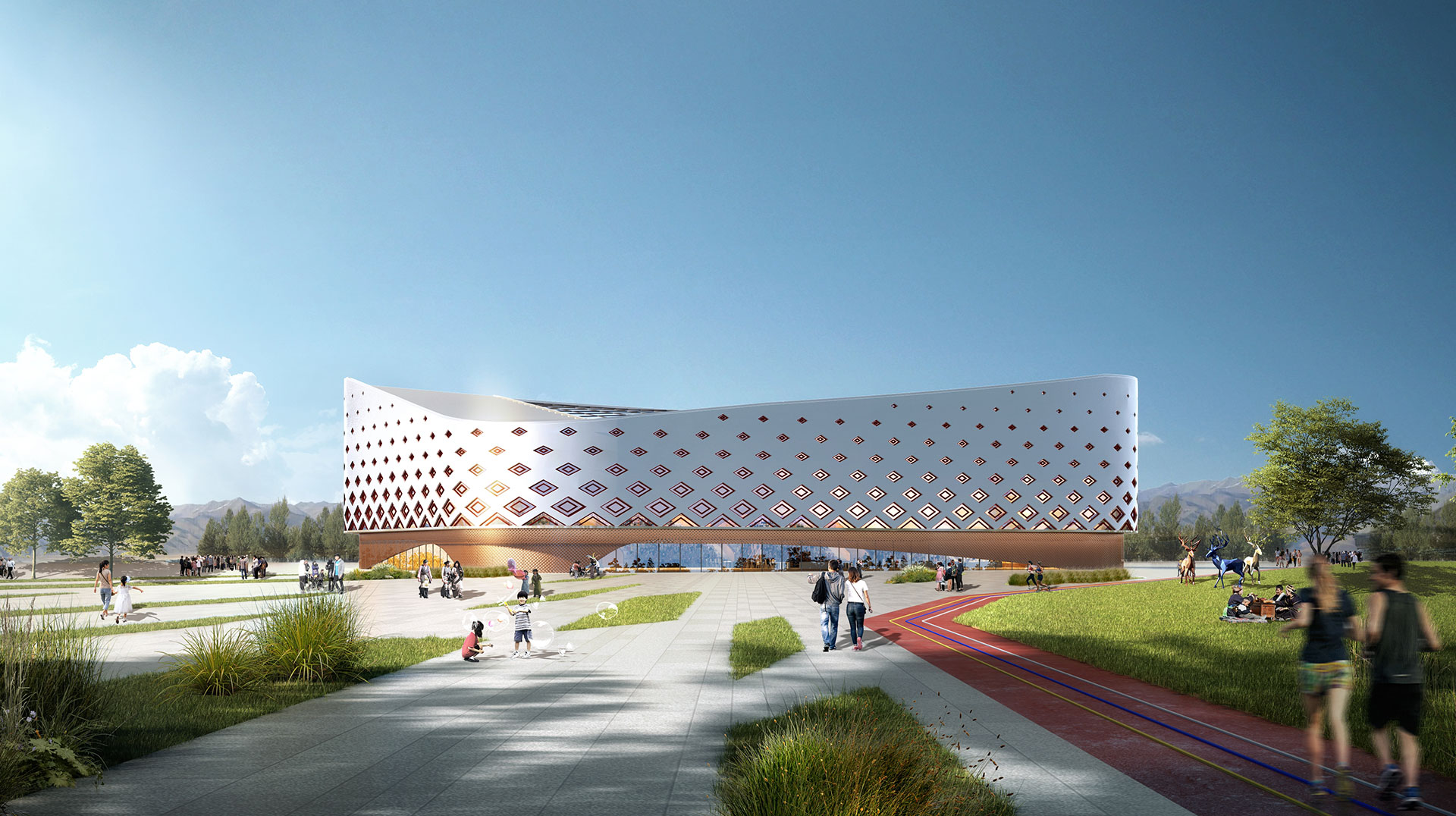 四大板塊以“社區服務核”為中心,伸展出一條核心景觀軸,以藏族“八吉祥”為景觀主題,串聯四大地塊,連接、服務、溝通整個扎東片區,同時輻射惠及周邊地塊居民,其間嵌入各類體育設施,構建藍綠交織的社區慢行軸。