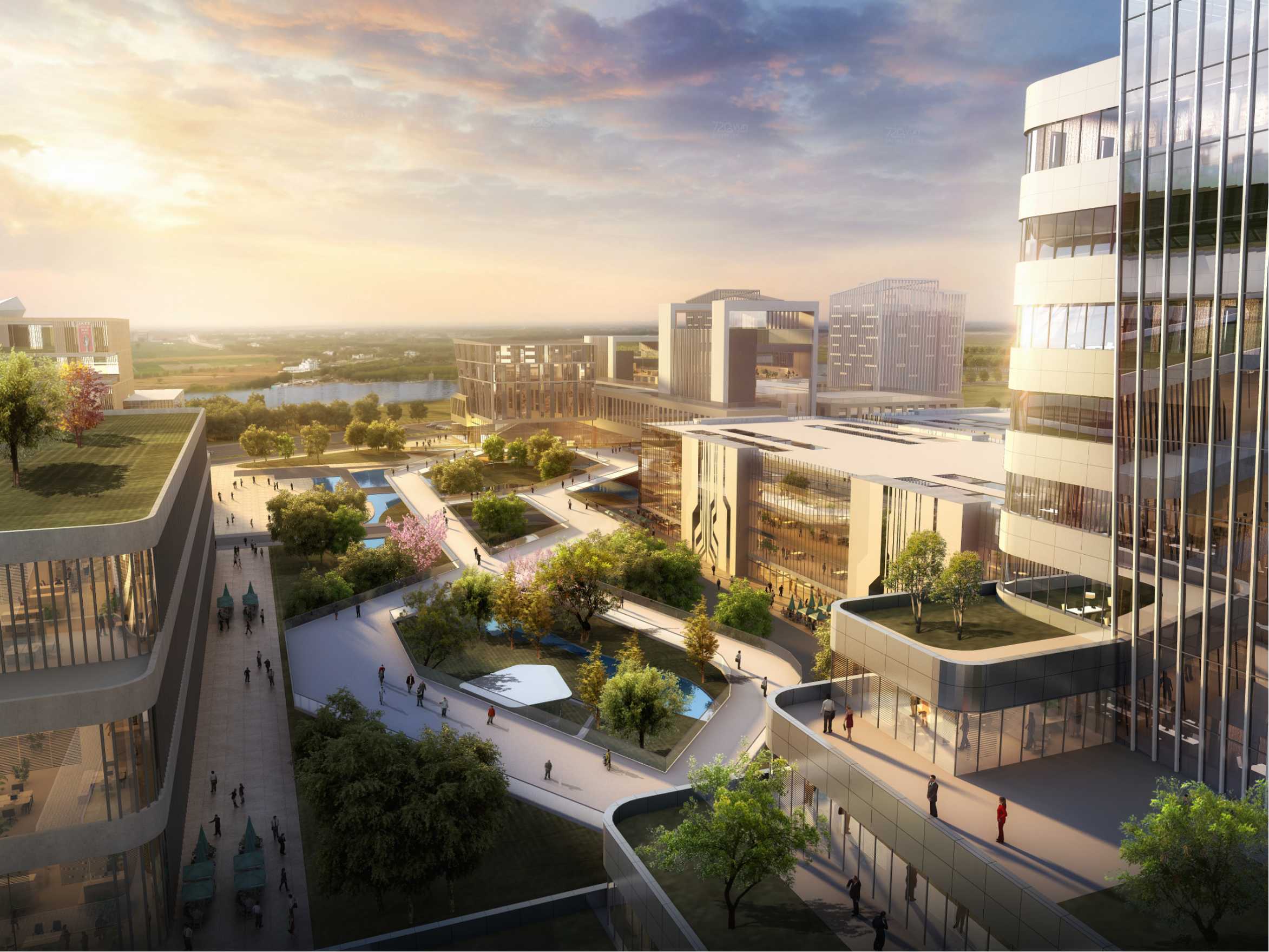 建筑外形設計上以一張“網”罩住兩個主要體量,形成優(yōu)雅的天際線,與共享、生態(tài)、交流的新空間。呼應人工智能總部主題,傳達“網連天下、智慧之谷”的建筑概念。建筑退臺適應形象與景觀軸線,視野直達河濱。