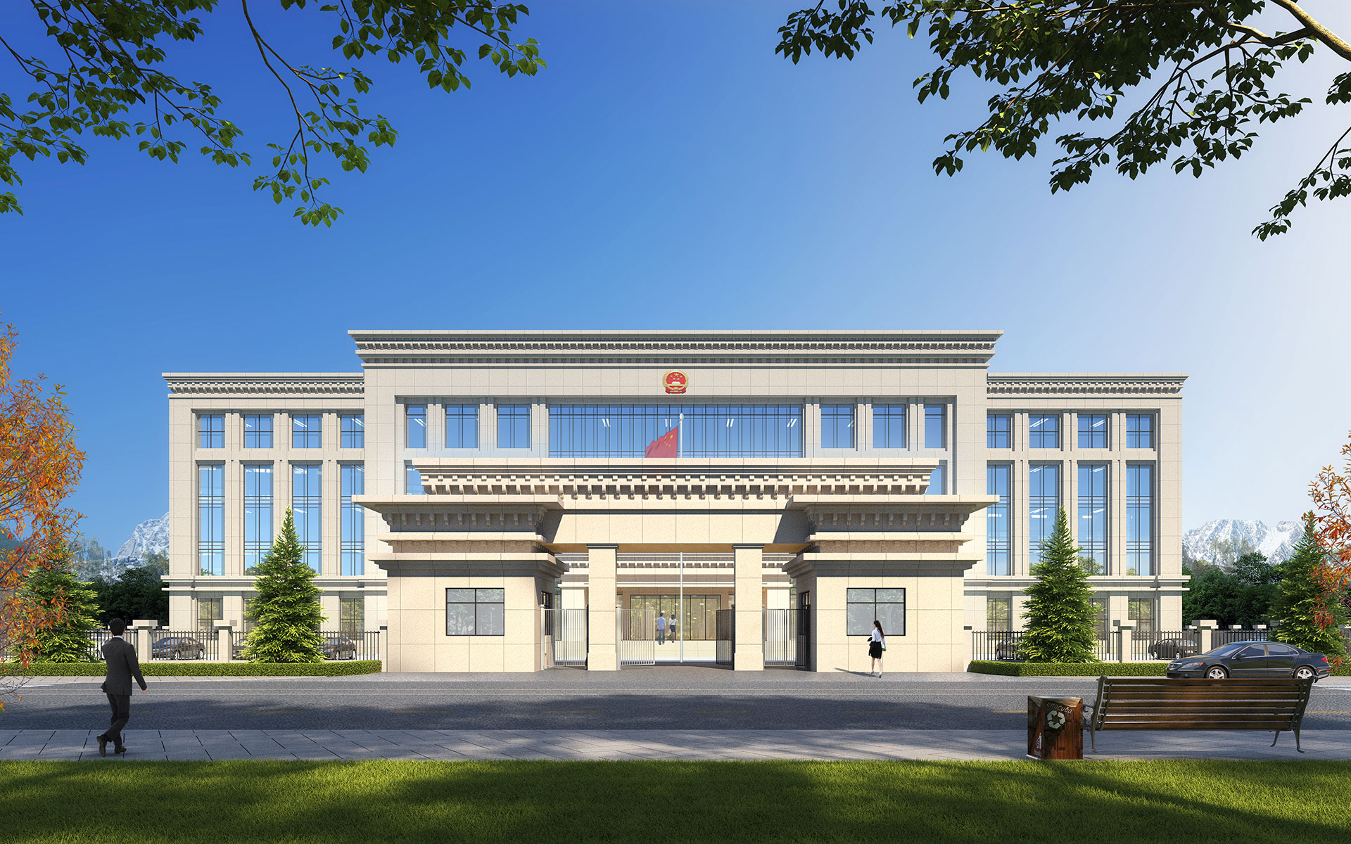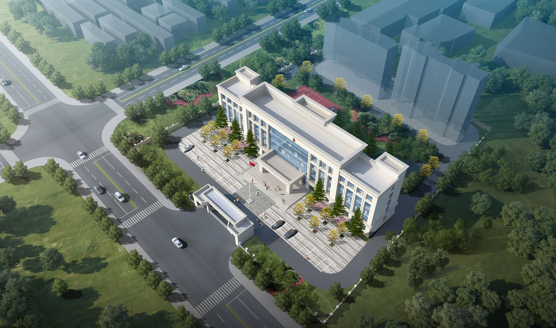 本設計結合地塊周邊道路與環境關系,將建筑布置成U字形,利用建筑圍合中庭花園空間,利用業務用房分隔公共禮儀空間與內部景觀空間,使其動靜分區明確,前廣場莊嚴大氣,內中庭幽靜愜意,極大的提升建筑群整體景觀環境品質。